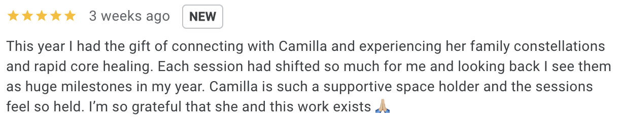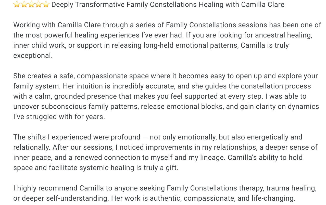 Family Constellations work beautifully online and Camilla facilitates for clients all over the world, including the USA, Canada, Australia, New Zealand, and the UK. You can learn more here.