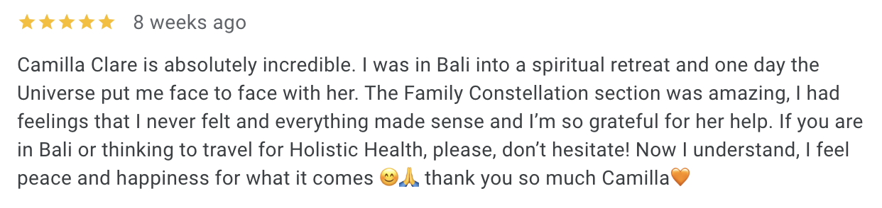 Camilla is a highly-experienced natural health practitioner based in Ubud, Bali, offering transformational Rapid Core Healing, Couples Constellations, and Family Constellations both in person and online globally.