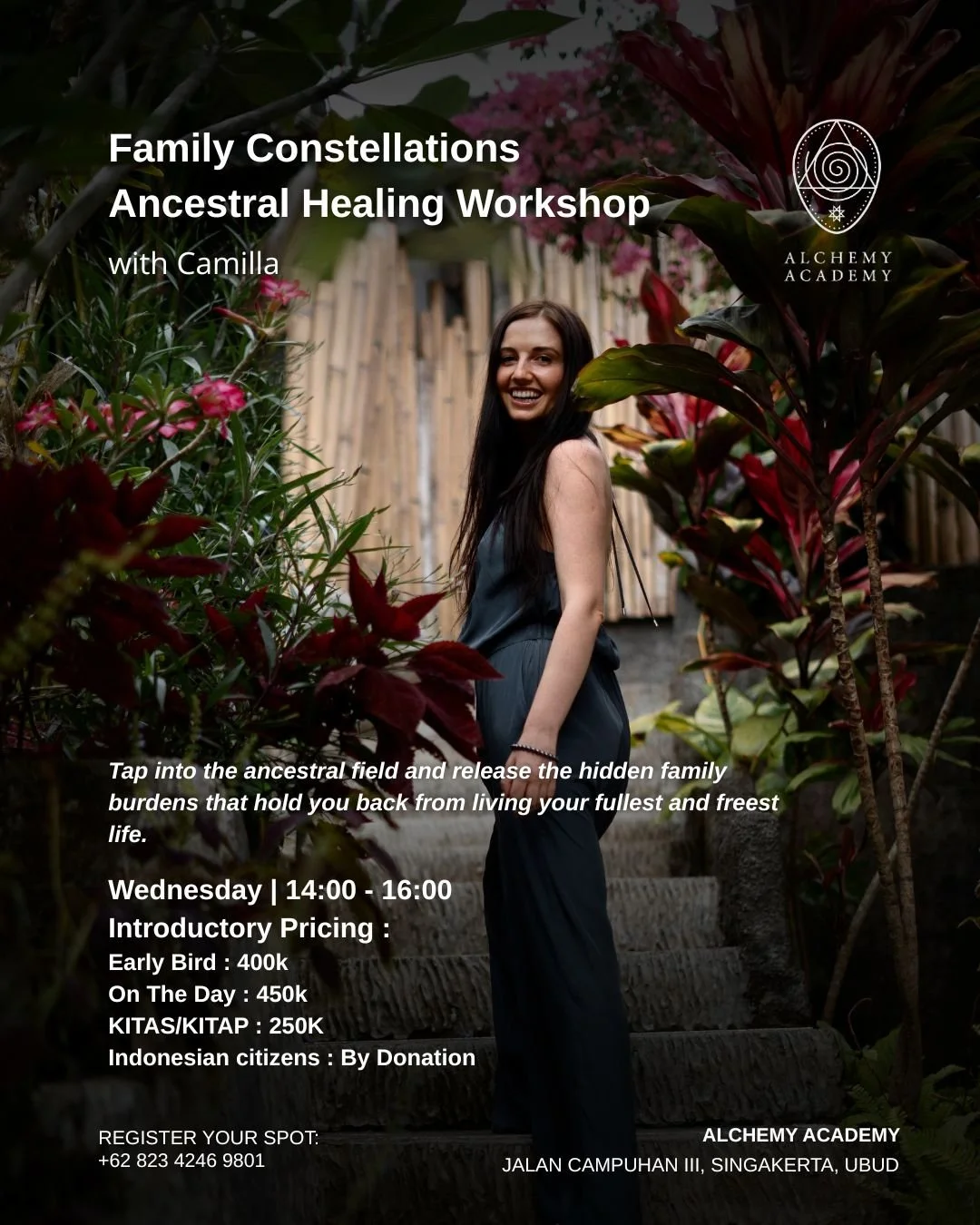Held in the heart of Ubud at Alchemy Academy, these workshops invite you into a deeper process of ancestral and emotional healing. Through the Family Constellations process, you can begin to uncover what has been silently carried through your family system and bring movement to patterns that may have left you feeling stuck, burdened, or unable to fully move forward.